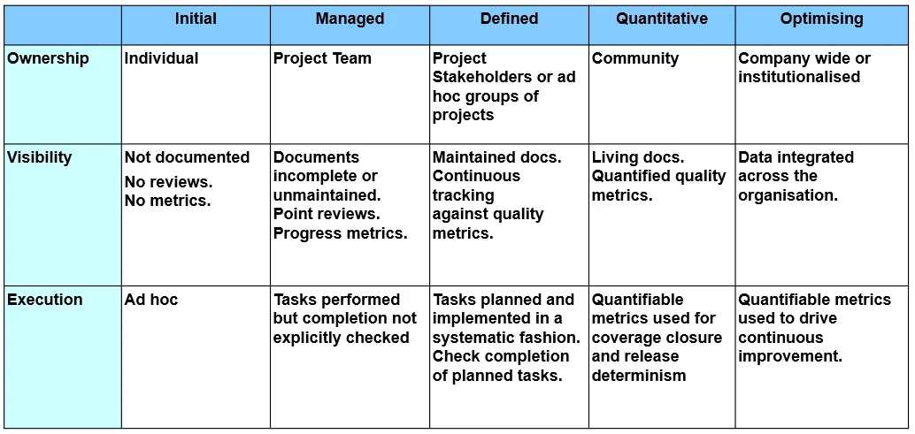 This table illustrates how verification capability typically evolves across ownership, visibility, and execution. Early stages are characterised by individual ownership, limited documentation, and ad hoc execution. As maturity increases, responsibility broadens, visibility improves through maintained artefacts and metrics, and execution becomes systematic and measurable. At higher maturity levels, verification data is integrated across the organisation and used to drive continuous improvement.
