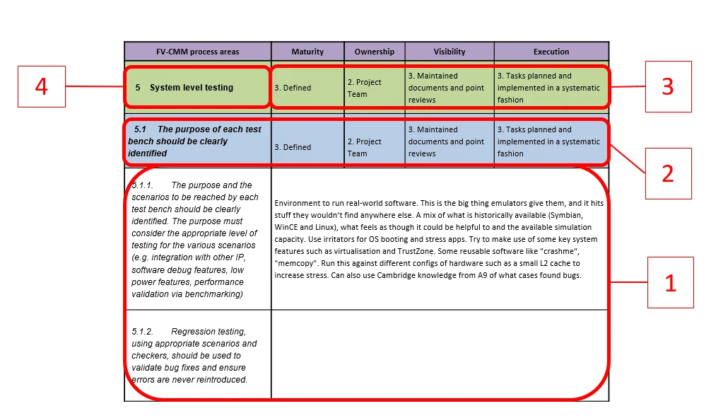 Each verification activity is evaluated within a clearly defined process area, such as specification intent, system-level testing, regression strategy, or closure discipline. This ensures assessment reflects how verification work is actually structured, rather than how it is described in abstract methodologies. - Maturity of execution
